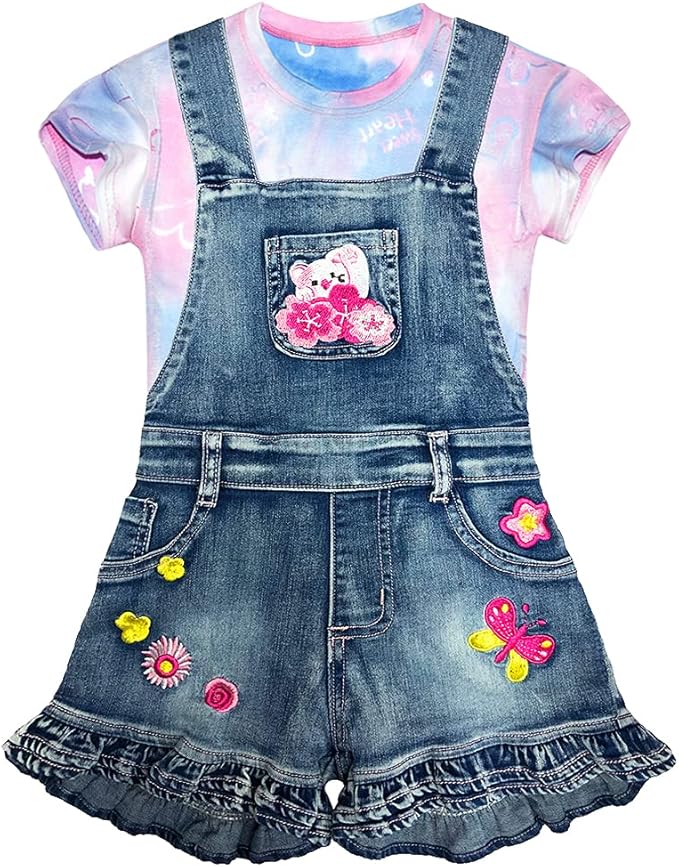 Summer Little&Big Girls 2pcs Clothing Sets Short Sleeve T-Shirt and Denim Suspenders Shorts