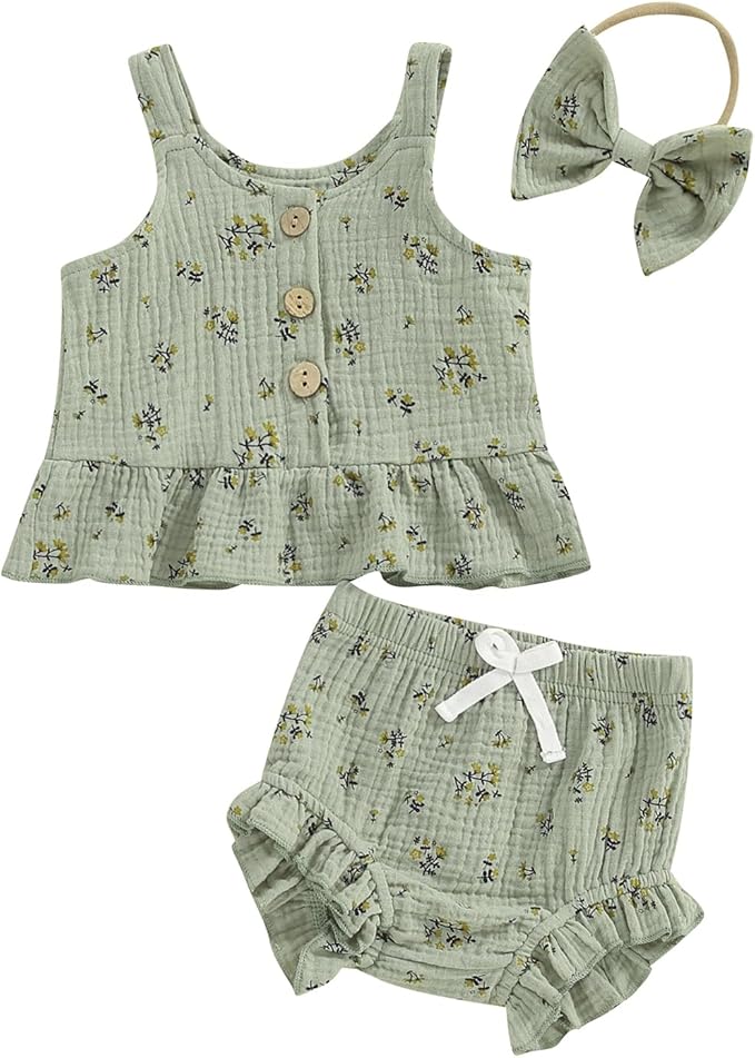 Infant Baby Girl Summer Clothes Floral Halter Sleeveless Tank Top Ruffle Shorts Cute Bow Headband 3 Piece Outfit Set