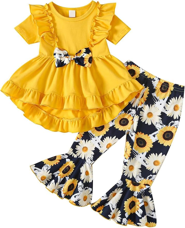 Toddler Baby Girl Clothes Bell Bottoms Outfit Ruffle Shirt Tops and Floral Flared Pant Set Little Girls Outfits Set