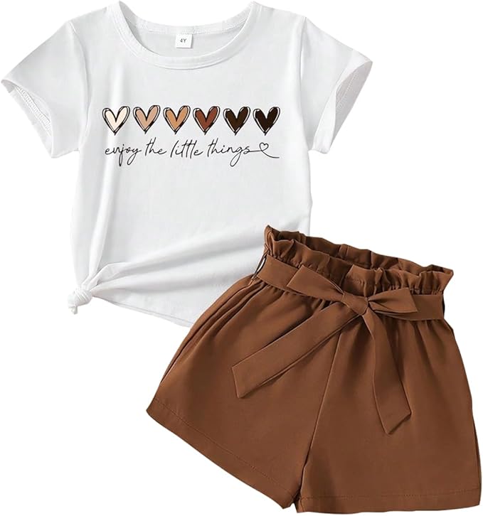 Kid Shorts Girls-Heart Print Short-Sleeved T-Shirt & Paper Bag Waist Belted Shorts-Short Sleeve Set (3-7T)