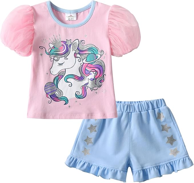 Girls 2 Piece Outfits Short Sleeve T Shirt and Drawstring Shorts Summer Clothing Sets