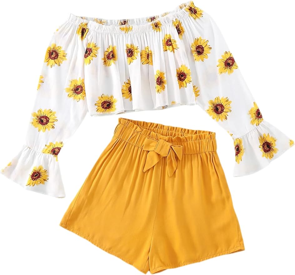 Girl's 2 Piece Outfit Summer Boho Floral Print Long Sleeve Top and Shorts Set Cute Clothes for Girls