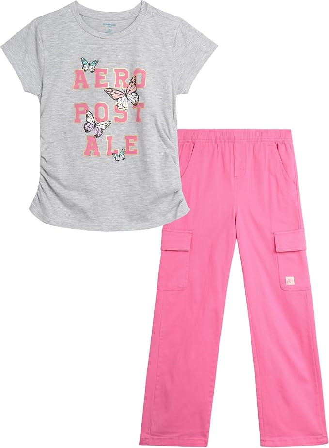 Girls' Pants Set - 2 Piece All Over Print Graphic Tee and Denim Cargo Pants - Casual Outfit for Girls (7-16)