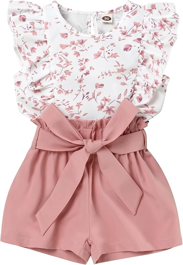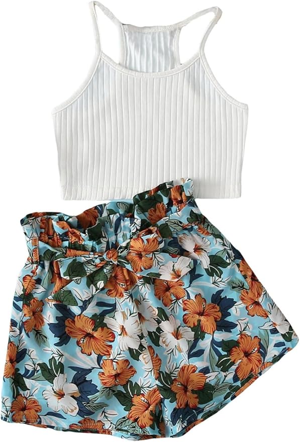Girl's 2 Piece Outfits Floral Sleeveless Crop Cami Top and Belted Shorts Set