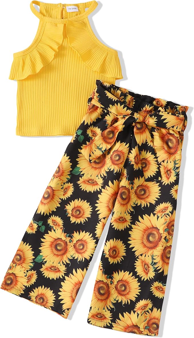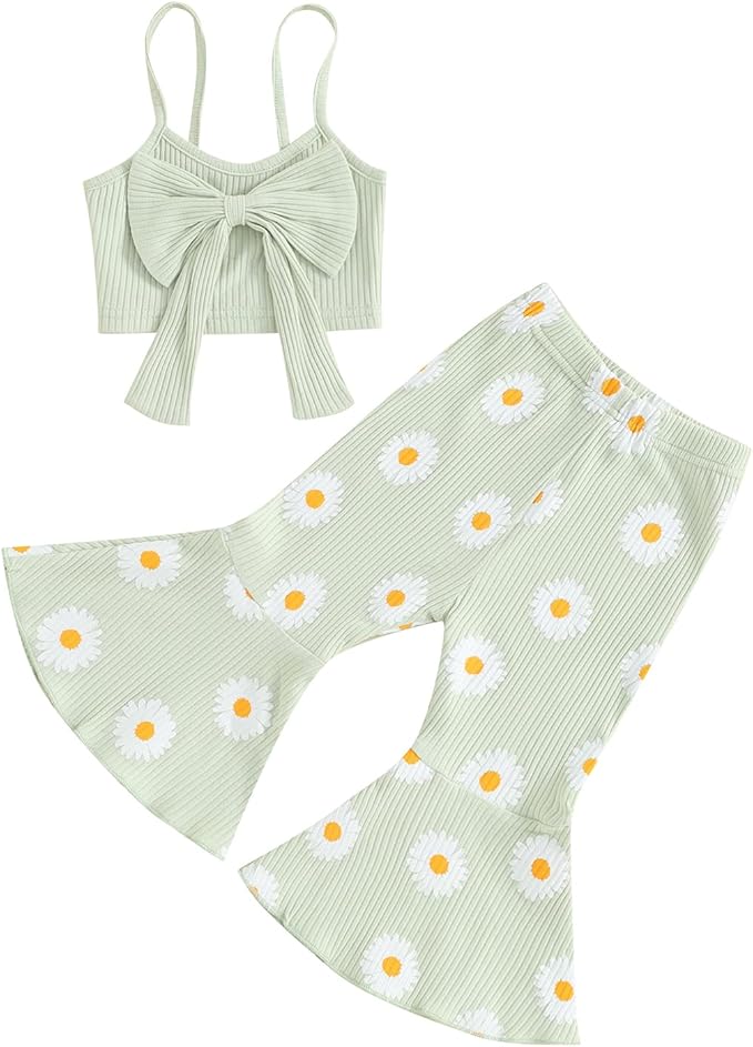 Baby Girl Summer Cothes Toddler Bell-bottom Outfits Sleeveless Bow Cami Crop Tops + Daisy Flare Pants Set