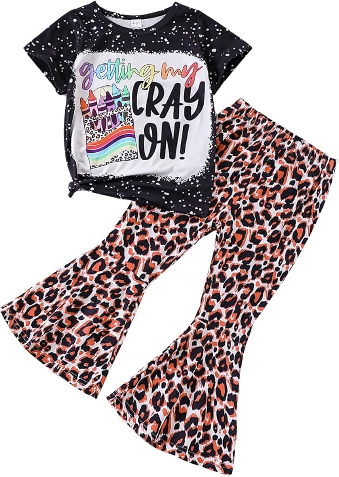 Kids Toddler Girl Clothes Letter Print Graphic Top + Leopard Print Flare Leg Pants 2PC Summer Clothing Set