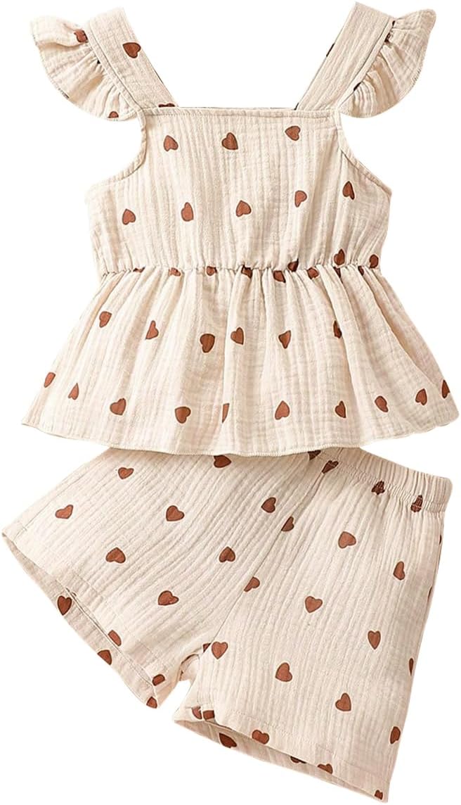 Toddler Little Girl Cotton Summer Clothes Sleeveless Top Ruffle Trim Heart Printed Shorts 2Pcs Outfits Set