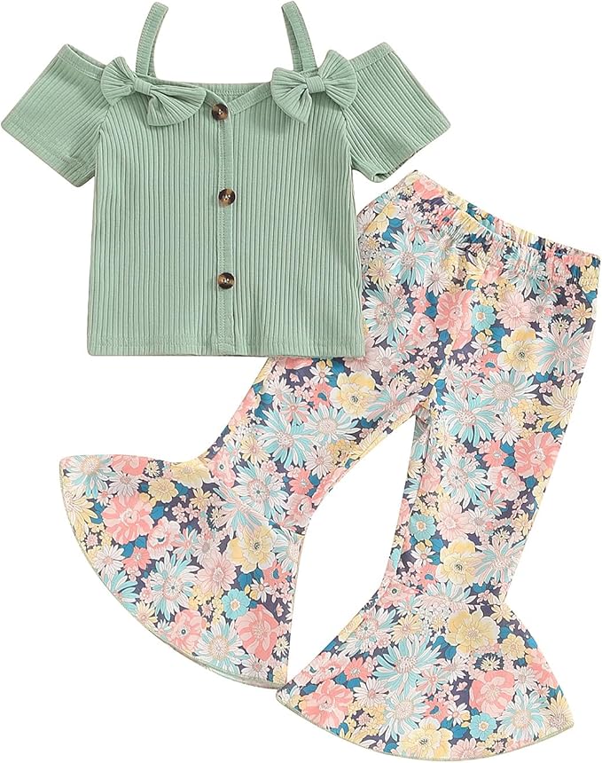 Toddler Baby Girl 2Pcs Summer Clothes Set Cold Shoulder Knit Ribbed Tops Floral Bell Bottom Outfits 1-6T